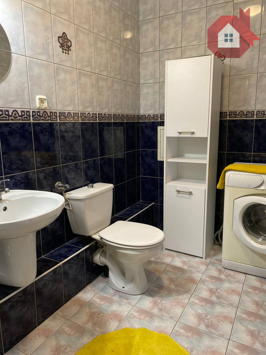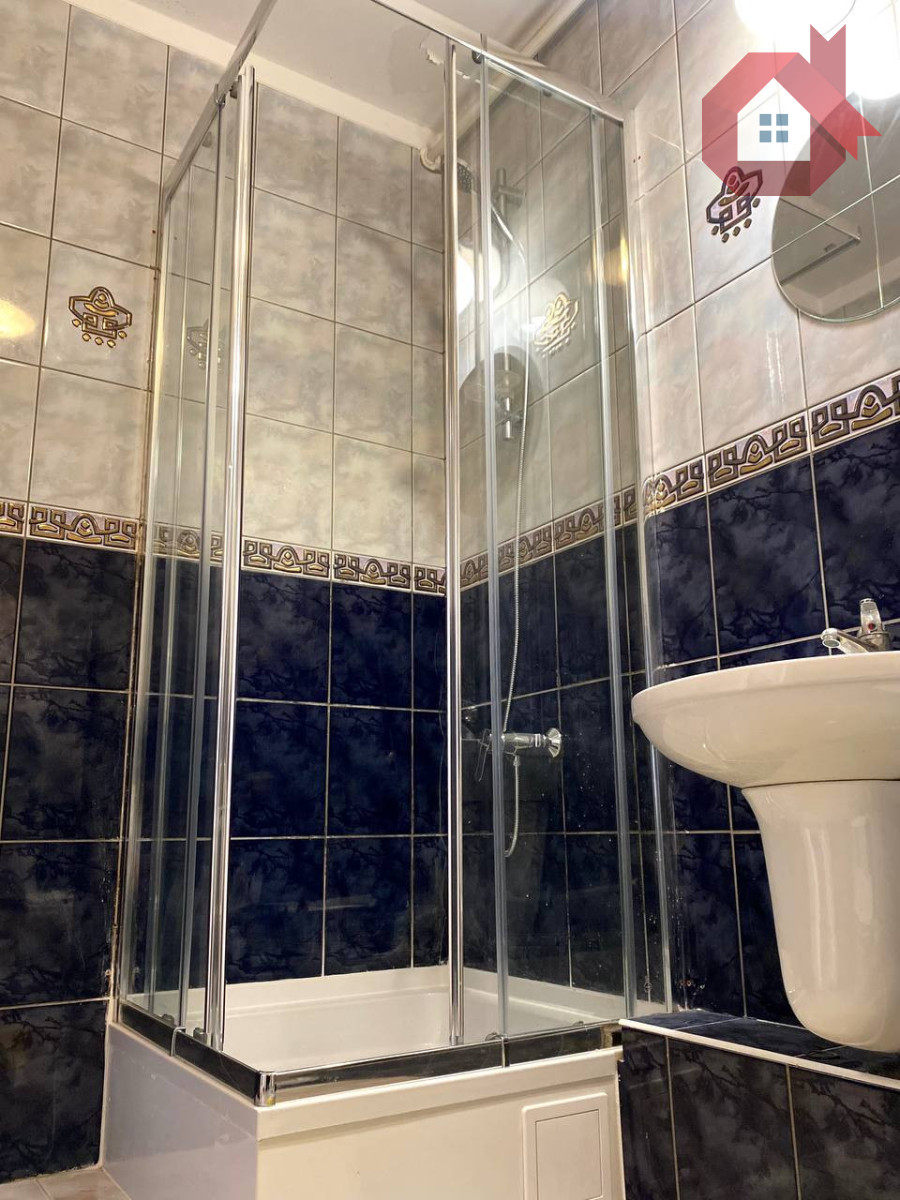 Wyposażenie obejmuje szafę wnękową, komodę, sofę, stolik RTV oraz wymienioną kabinę prysznicową.