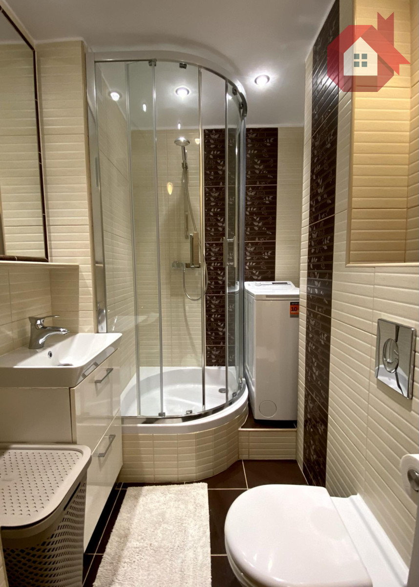 The bathroom includes a new washing machine.