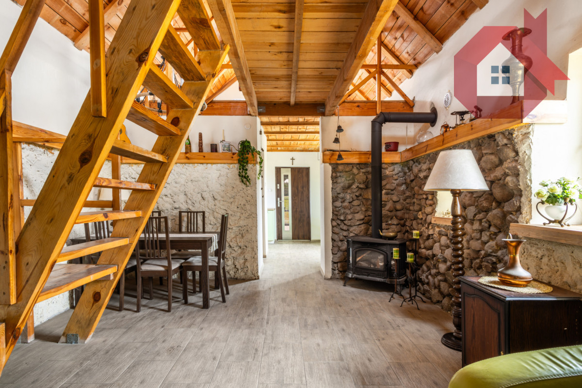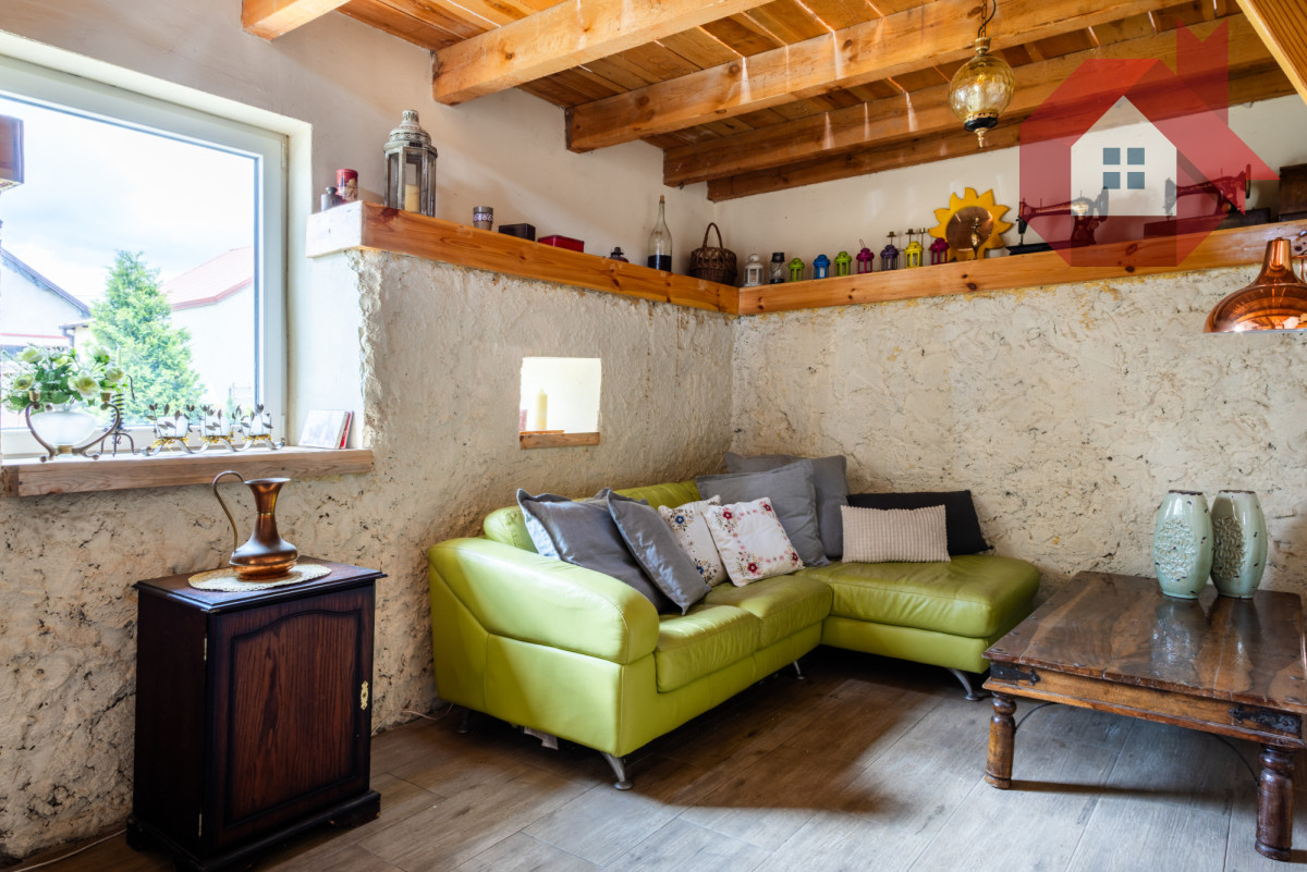 - salon z kominkiem ze strefą jadalną i wypoczynkową - w pełni odrestaurowany z szacunkiem do zabytkowych elementów drewniano-kamiennych