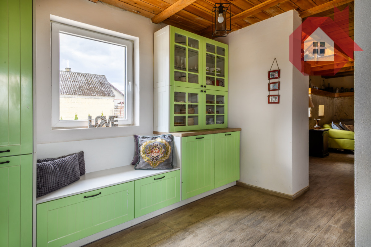 Na parterze:- aneks kuchenny z niezbędnym sprzętem, intrygującą zabudową meblową skrywającą kolekcję fantastycznej ceramiki i wygodną ławą przy oknie stworzoną po to by podziwiać naturę